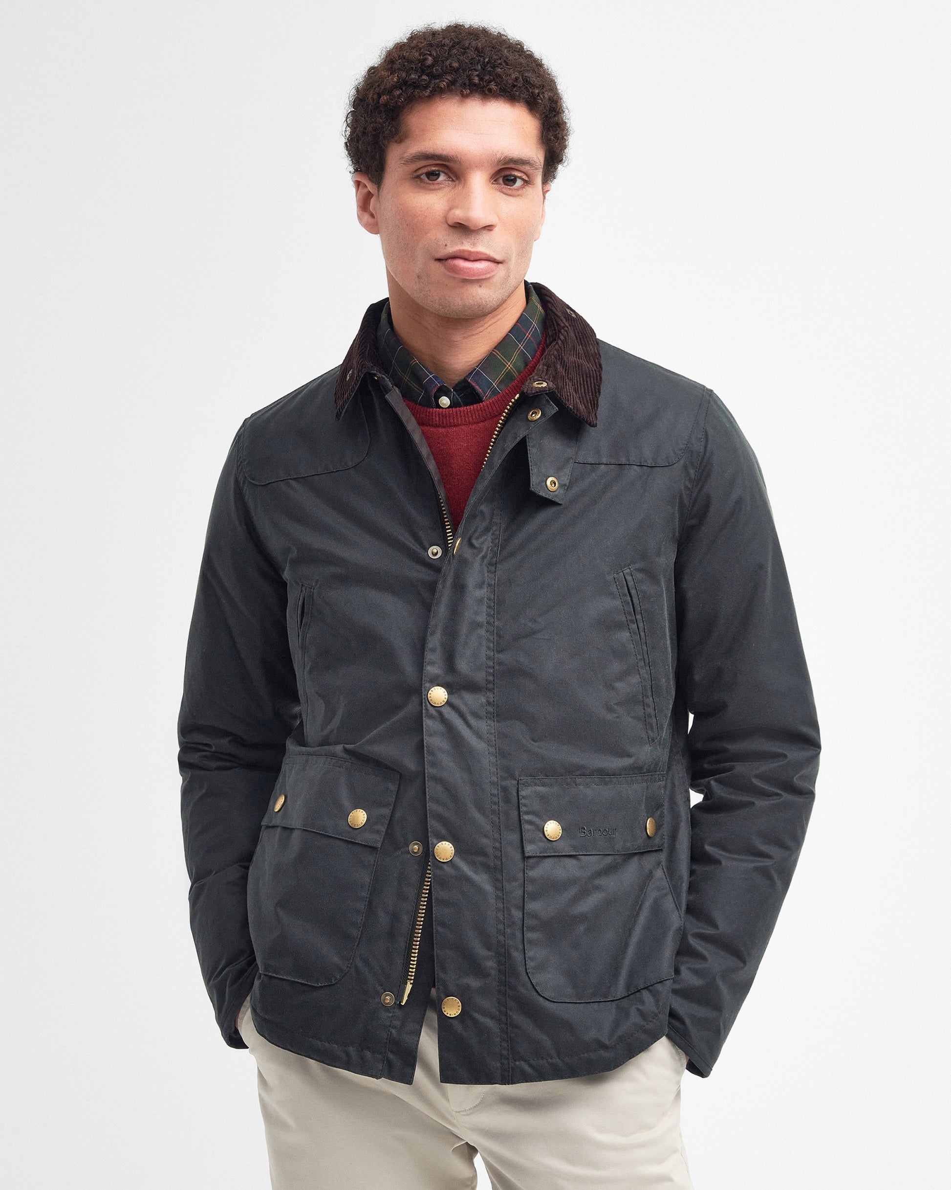 La giacca Reelin, rivisitazione invernale dell'iconica formula Barbour, è realizzata in cotone cerato e presenta una fodera trapuntata con il caratteristico disegno tartan antico.