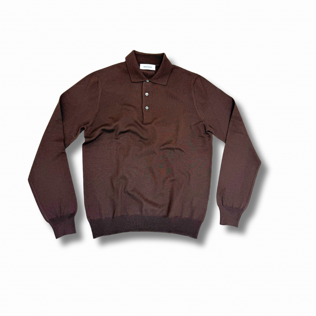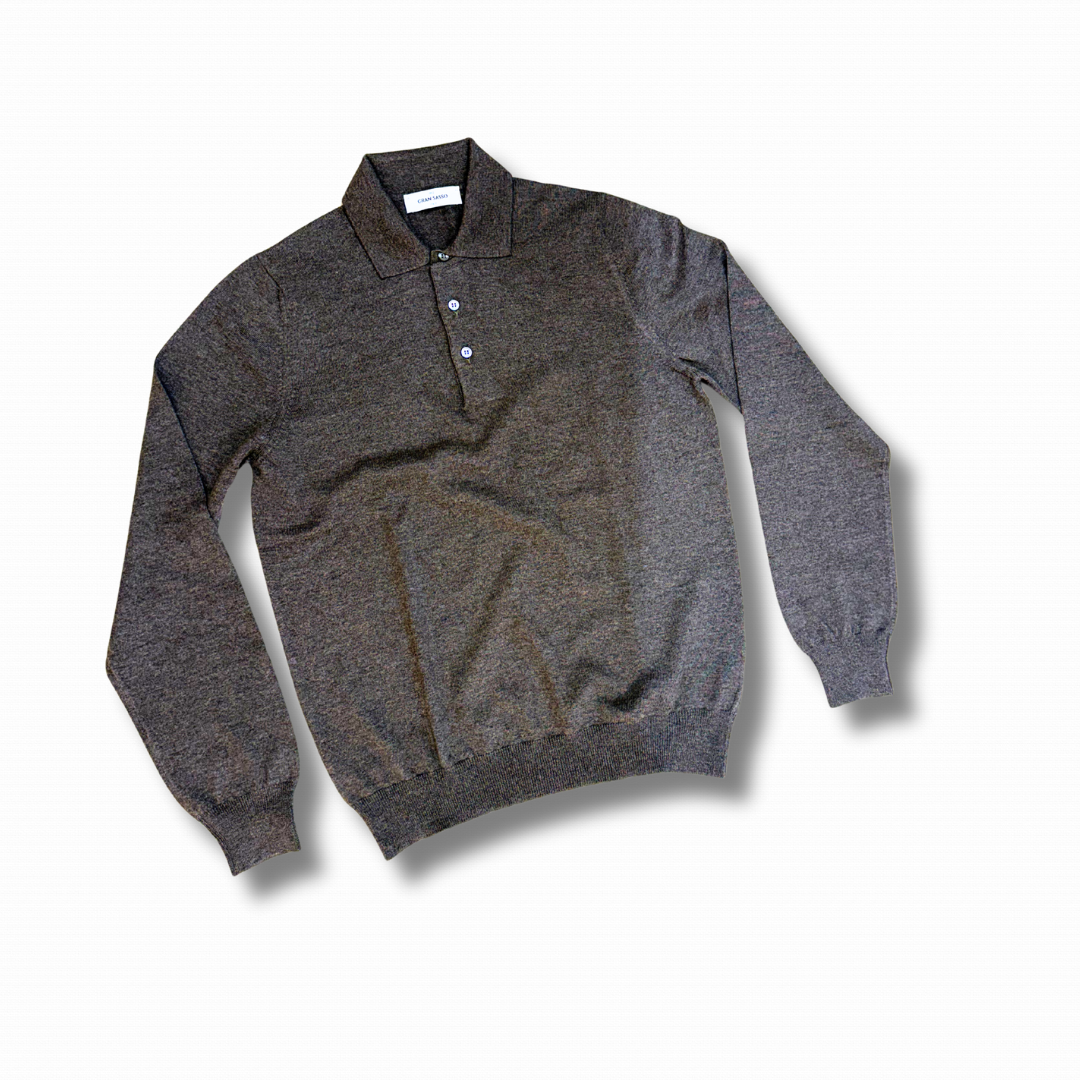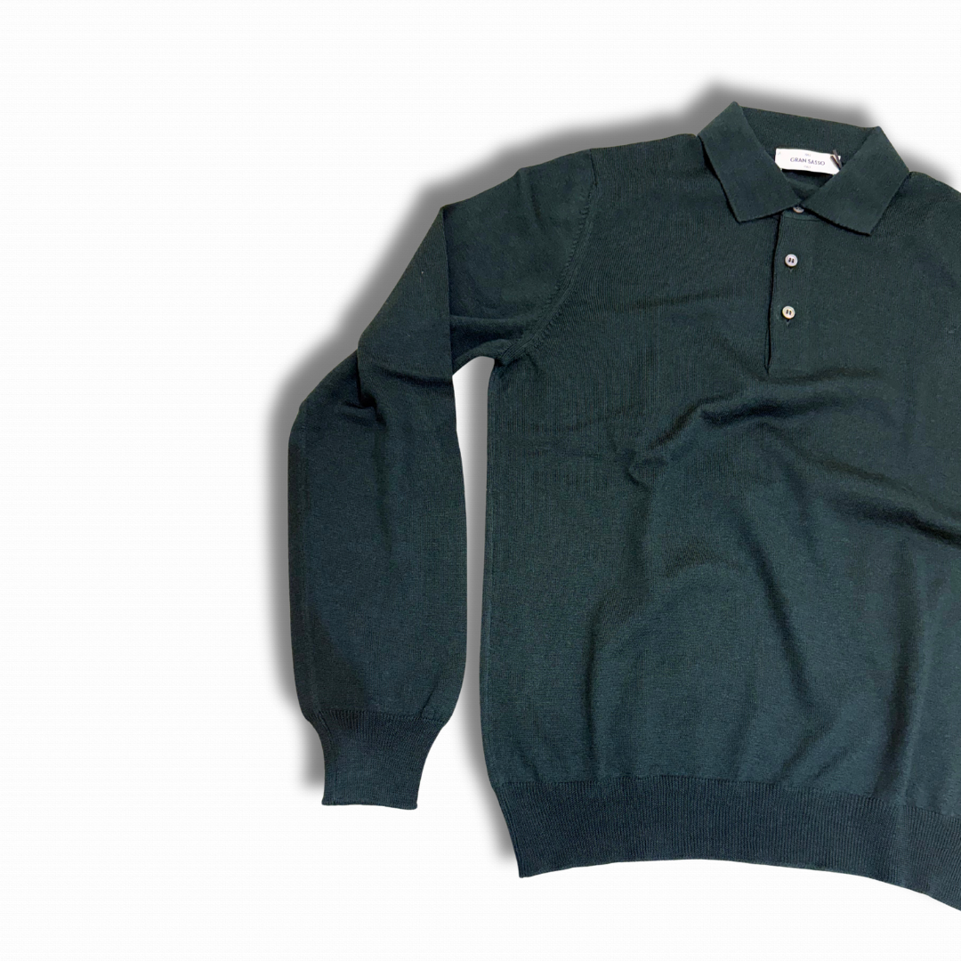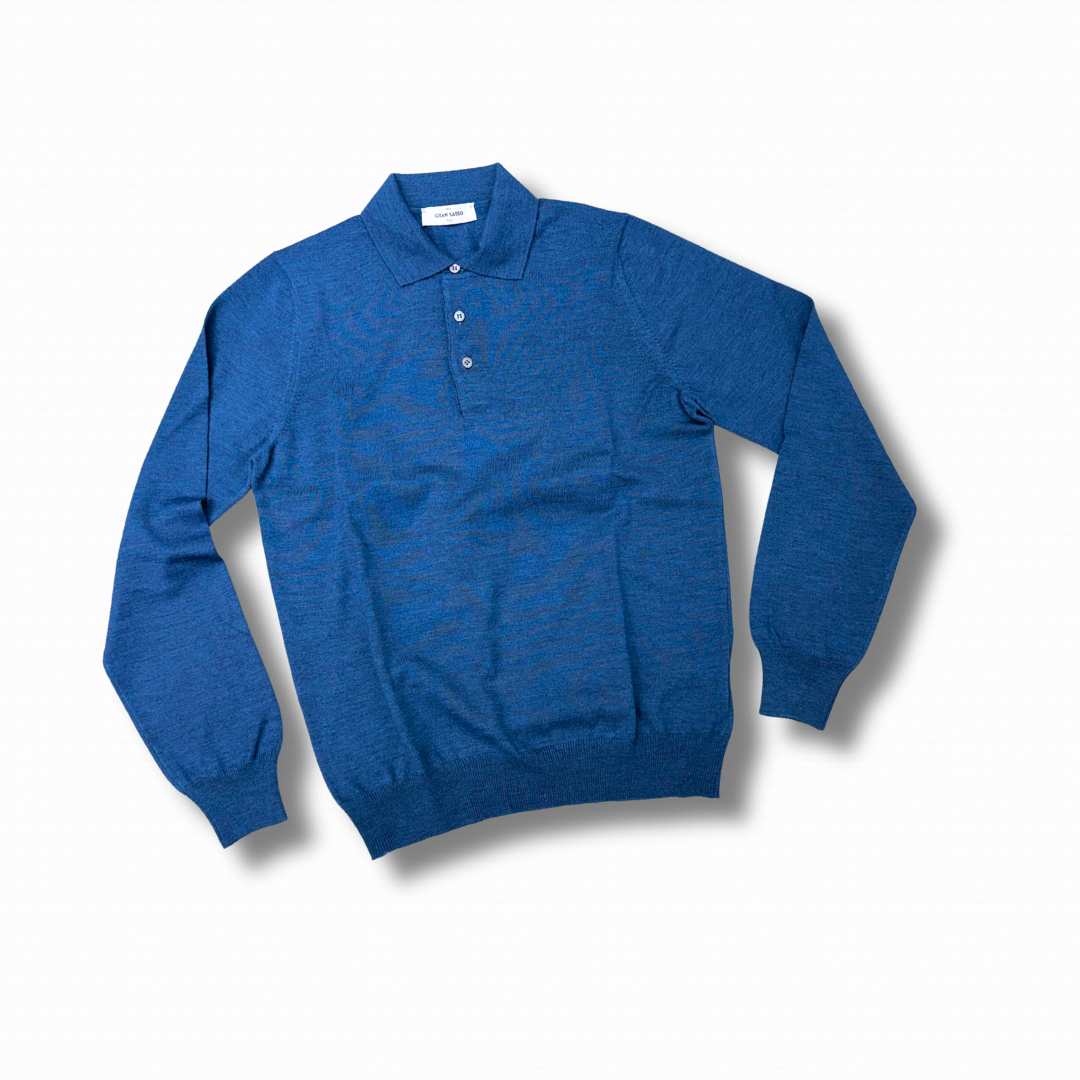 Polo a manica lunga realizzata, il Italia, con lana merino Extra Fine, morbida e piacevole, ideale sia per la stagione intermedia che per i mesi più freddi.