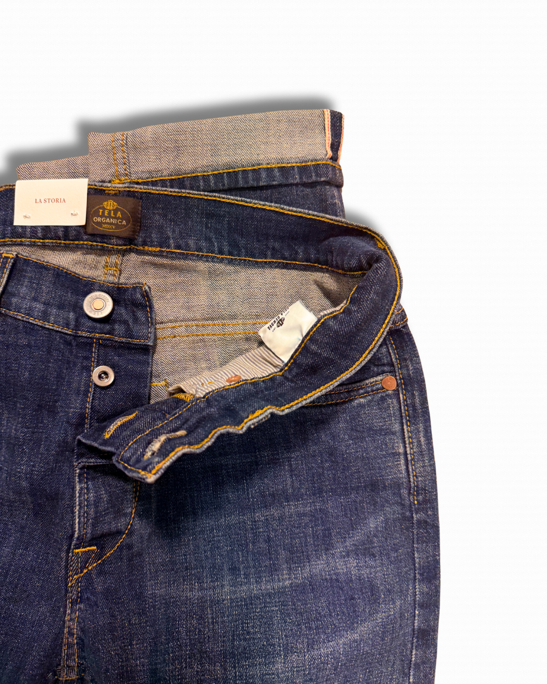 Realizzato in Italia con una tela di un tono di blu medio, logicamente cimosato, chiusura a bottoni e salpa posteriore in pelle.